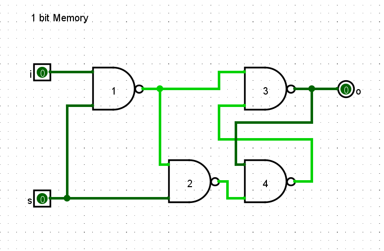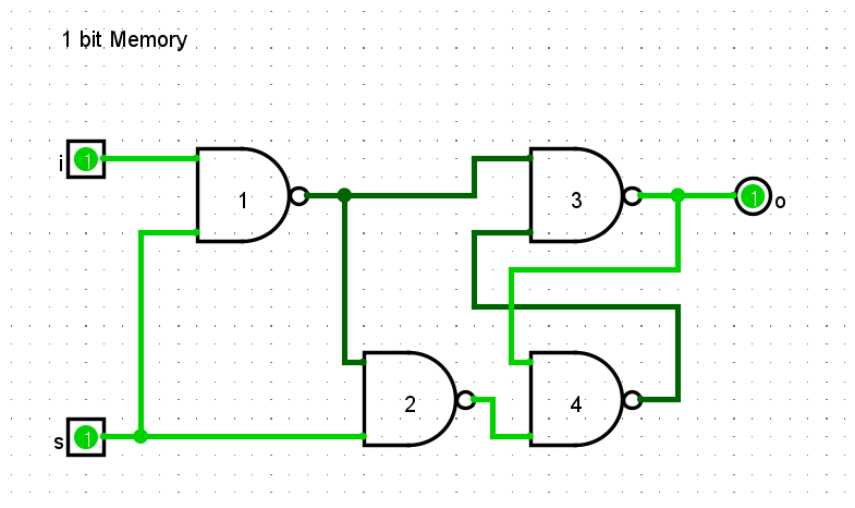 여기서 우리는 UNIVERSAL Gate인 NAND 4개를 사용해서 1bit 메모리를 생성했다. 하나하나 따져 보면서 작동 원리를 파악해보자.