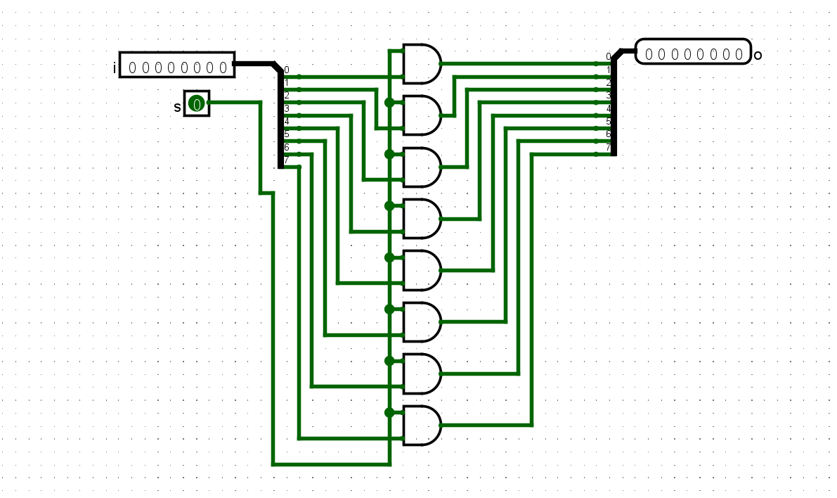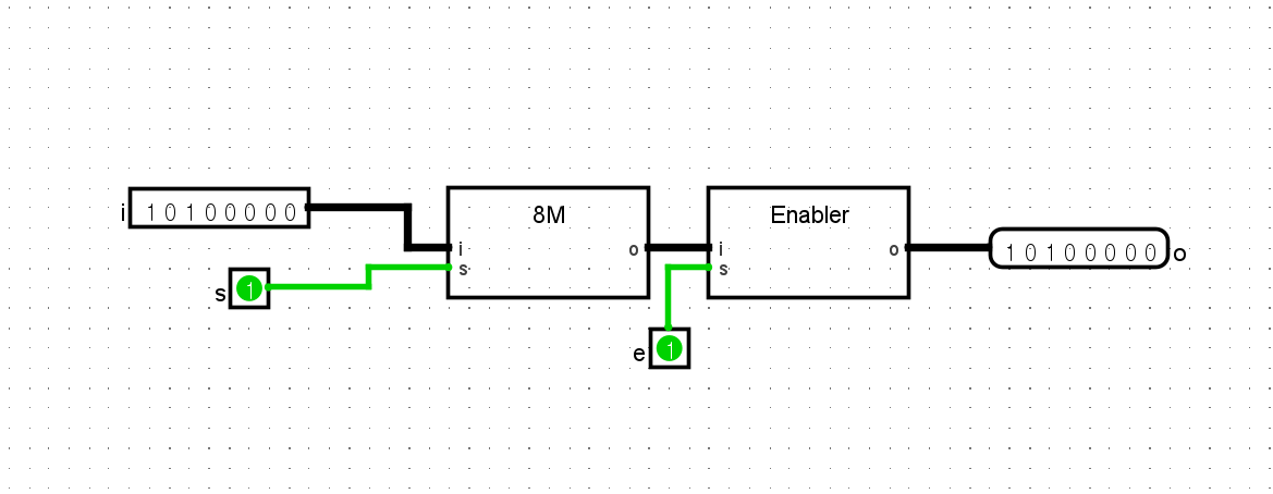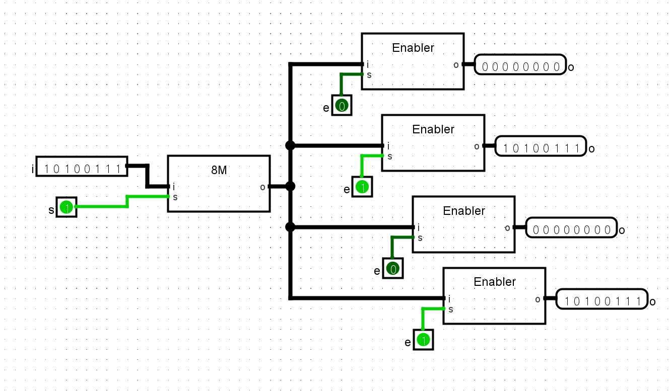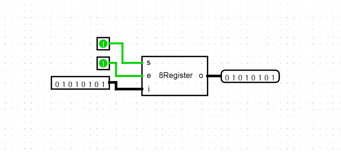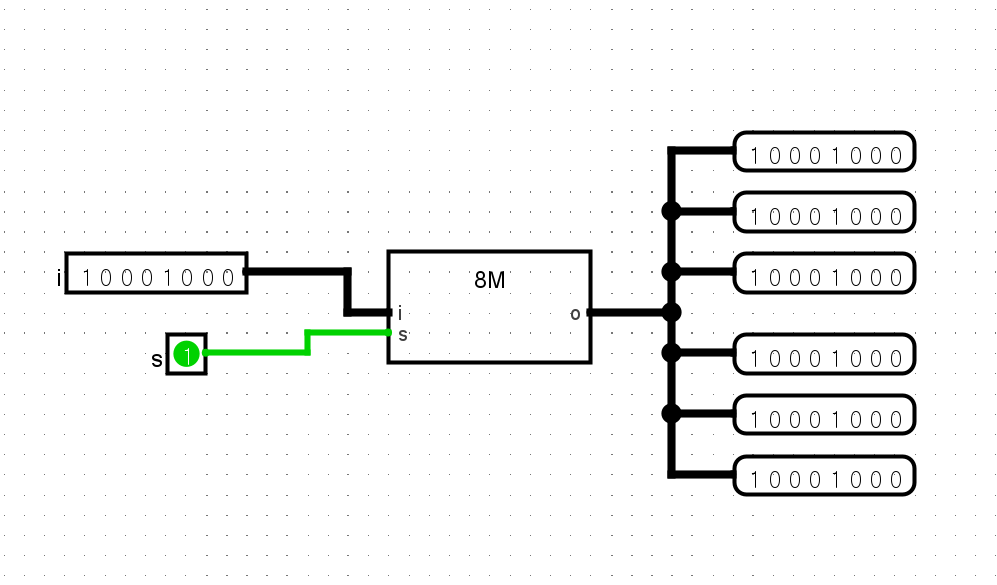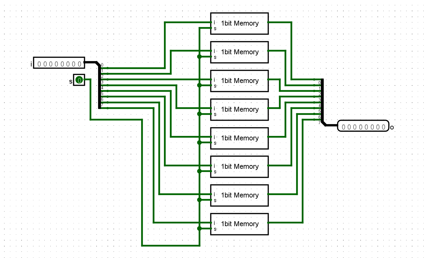 전에 우리는 3가지에 따라 상태의 값이 바뀌는 것을 알았다. 그 3가지는 input과 set그리고 output에 따라 변화가 되는 것이 였다. 결과 적으로 1bit 메모리 칩에서는 3가지의 포트를 가지게 되는 것이다. (2가지의 input과 1가지의 output의 포트로 구성되어 있는 것이다.) 앞서 말했던 것 처럼 set의 s는 그저 on/off와 같은 역할을 하는 것이고 input의 i의 결과 값에 따라 output의 결과 값이 전달 되는 것이다. 이제 이 메모리들을 8비트로 늘려 보려한다.