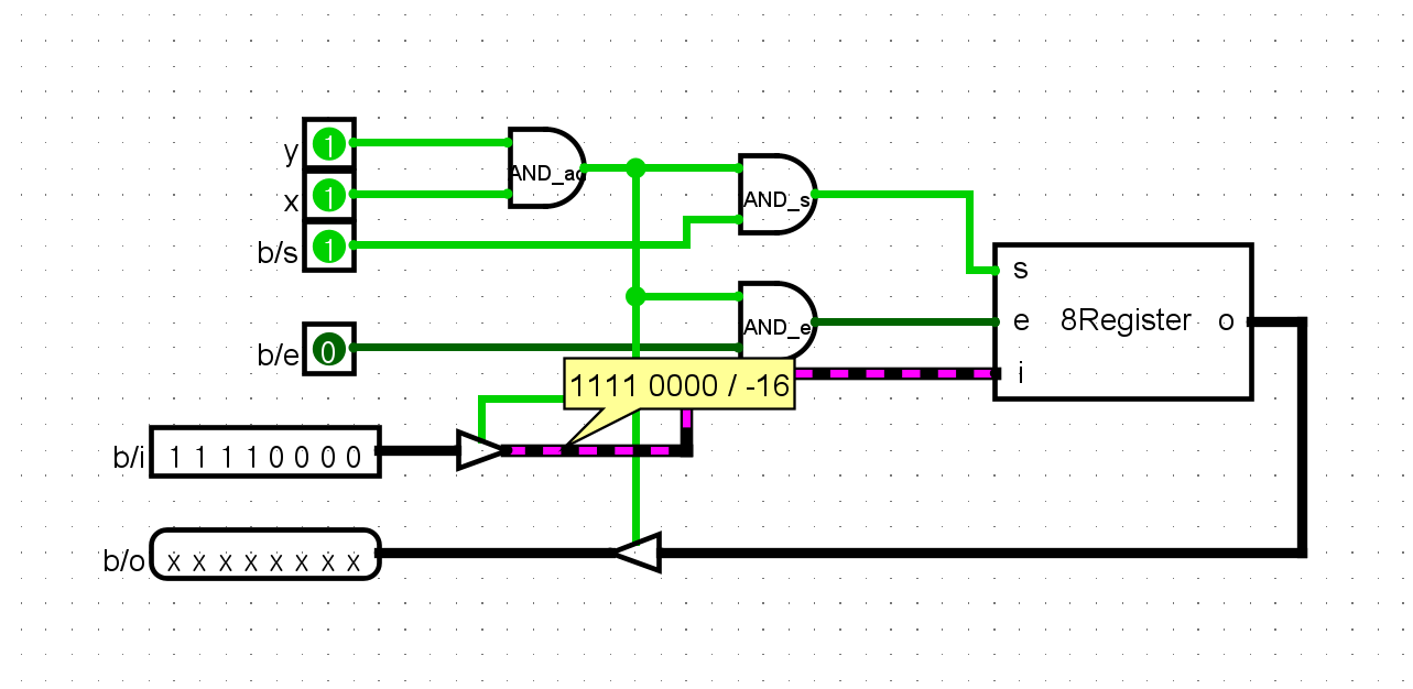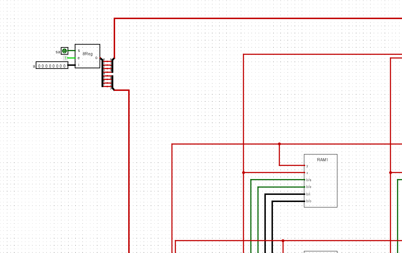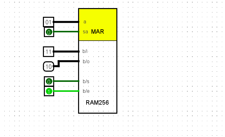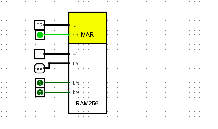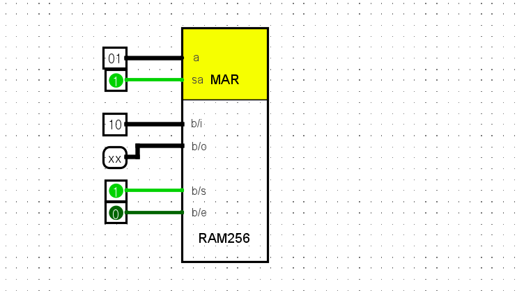 여기서 완성된 256RAM을 보면 MAR이란 Memory Address Register로 데이터를 읽거나 쓰기 위한 레지스터이다. 따라서 MAR에서 해당 address(a)의 주소 값을 지정한다. 이는 해당 위치의 RAM1의 위치를 지정하고 이에 set address로 값을 전달하면 해당 RAM 위치에 값을 저장할 수 있는 상태(해당 위치를 가리키는 것.)가 되고 이후 필요한 값을 b의 input으로 저장할 데이터 값을 지정하고 b의 set을 완료하면 값이 해당 address로 저장이 된다. 이후 Enabler를 활성화 하면 해당 address 위치의 값이 b의 output으로 전달된다. 이 모습은 C언어의 포인터의 구성과도 같다. 저급언어로 내려 갈 수록 컴퓨터 시스템의 구조와 가까워진다. 아래는 값이 저장되고 해당 값을 불러오는 모습이다.