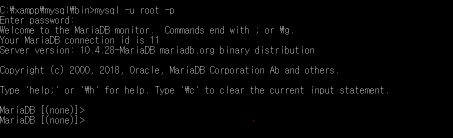 ์ฌ๊ธฐ์ ๋นํฉํ ๊ฒ์ด๋ค. ๋ณดํต์ MySQL ์คํ ํ๋ก๊ทธ๋จ์ ์ค์นํ๋ฉด ์ค์น ์ด๊ธฐ ๋ ๋น๋ฐ๋ฒํธ๋ฅผ ์ค์ ํ์ง๋ง XMAPP์์ ๊ทธ๋ ์ง ์๋ค. ๋น๋ฐ๋ฒํธ๊ฐ ์์ผ๋ฏ๋ก ๊ทธ๋ฅ Enter๋ง ์ ๋ ฅํ๋ฉด ๋ฐ๋ก ์คํ์ด ๋๋ค.