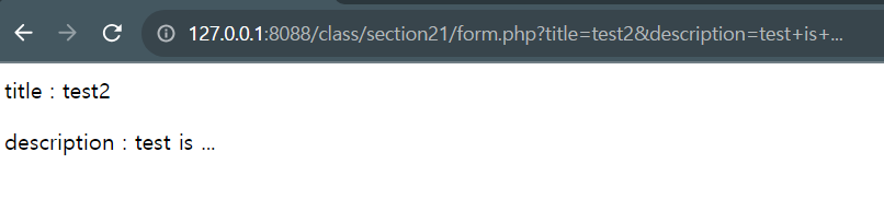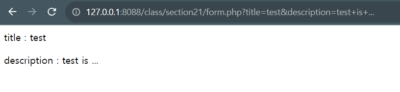 ์ด์ ์ฐ๋ฆฌ๋ phpํ์ผ์ ์์ฑํ๊ณ ์ฐ๋ฆฌ๊ฐ ์์ ๋ฐฐ์ ๋ ๋ฐ์ดํฐ์ ๊ฐ์ ๊ฐ์ ธ์ค๋ GET์ ์ด์ฉ ํ ๊ฒ์ด๋ค. ์ฌ๊ธฐ GET์์ ์๋ ๋ฌธ์๋ ํด๋น formํ๊ทธ์ name์ ๊ธฐ์ค์ผ๋ก ๋ฐ์ดํฐ๋ฅผ ๊ฐ์ ธ์ค๋ ๊ฒ์ด๋ค. ๋ฐ๋ผ์ $_GET['title']์ input์ ์์ฑ name์ธ 'title'์ ๊ฐ์ง๊ณ ์ค๋ ๊ฒ์ด๋ค. ๊ฒฐ๊ณผ๋ ์๋ ์ด๋ฏธ์ง๋ฅผ ํตํด์ ํ์ธํ์.