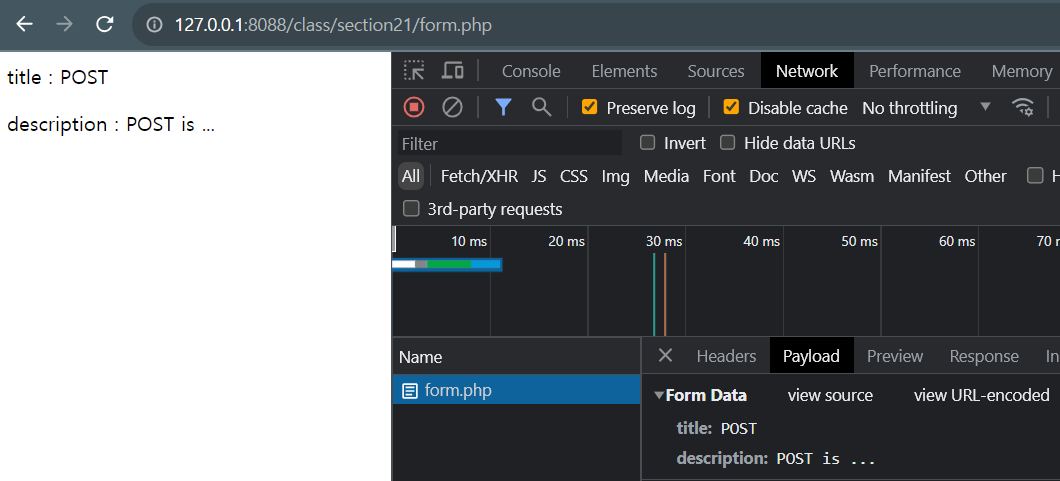 ์์ ์ฝ๋๋ ์ฐ๋ฆฌ๊ฐ ๋ง์ด ์ ํด๋ณธ html์ฝ๋์ด๋ค. ์ฌ๊ธฐ์ ์ฐ๋ฆฌ๊ฐ ์ฃผ์ ๊น๊ฒ ๋ด์ผํ ํ๊ทธ๋ formํ๊ทธ๋ก formํ๊ทธ๋ input ํ๊ทธ๋ฅผ ๊ฐ์ธ๊ณ ์์ผ๋ฉฐ formํ๊ทธ์ ์์ฑ์ธ action๊ณผ method ๋๊ฐ์ง๊ฐ ์๋ค. ์ฐ๋ฆฌ๊ฐ ์ฒ์ html์ ์ ํ ๋ ํฌ๊ฒ ๋ค๋ฃจ์ง ์์์๊ฑฐ๋ ๊ฐ๋ณ๊ฒ ๋์ด ๊ฐ์ง๋ง ์ฌ๊ธฐ์๋ php์ ์ฐ๊ฒฐํ๊ธฐ ์ํ ๊ฐ์ฅ ์ค์ํ ํ๊ทธ์ด๋ค. ์ฐ์ actionํ๊ทธ๋ ์ฐ๋ฆฌ๊ฐ ์๊ณ ์๋ฏ์ด ํด๋น ํ์ผ ๊ฒฝ๋ก๋ฅผ ์คํ์ํค๋ ์๋ฏธ์ด๋ค. ํ ๋ฒ์ฏค ์์ฉํด์ ์ฌ์ฉํด๋ณธ์ ์์ ๊ฒ์ด๋ค. method๋ ์๋ ์ฝ๋๋ฅผ ๋ณด๋ฉด์ ์ค๋ช ํ๊ฒ ๋ค.(์ฐธ๊ณ ๋ก ์ฌ๊ธฐ์ html์ Live Server๋ฅผ ์คํ์ํค๋ ๊ฒ์ด ์๋๋ผ 127.0.01:PortNumber/~๋ก ์ฐ๊ฒฐํ๋ ๊ฒ์ด๋ค.)
