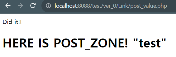 POST는 GET과 코드는 유사해 보이지만 form의 데이터처리 결과가 다르다. POST는 사용자 인터페이스인 웹브라우저 URL에 표기 되지가 않는다. 물론 의도적으로 POST된 데이터의 값을 echo나 HTML코드를 통해서 $_POST값을 대입하면 아래 이미지 처럼 보여줄 수는 있다. 원래 POST의 용도는 전달 된 데이터가 밖으로 유실되지 않고 은밀하게 전달되기 위함이라는 것을 알아두자.