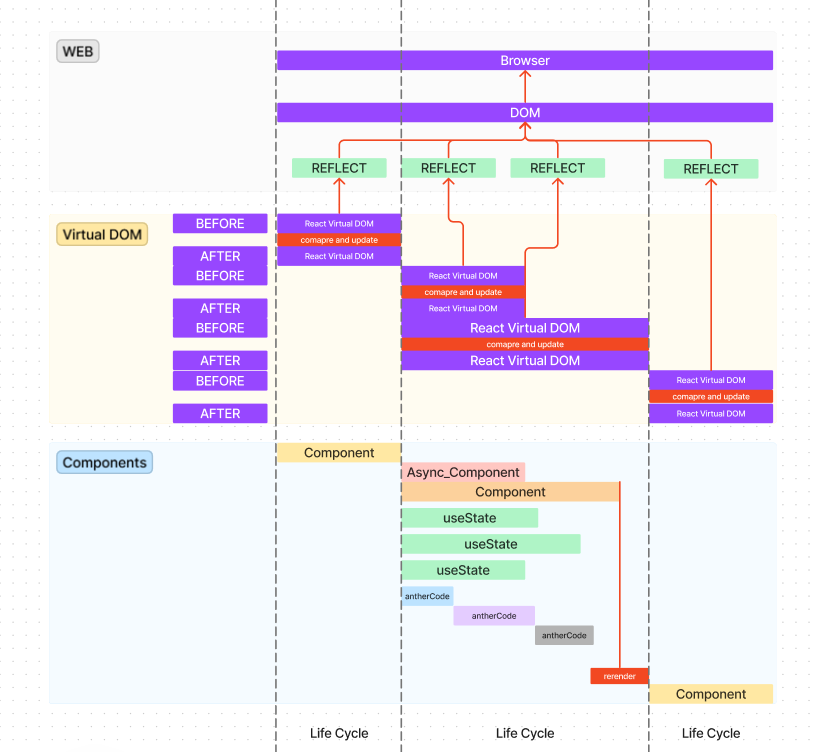 컴포넌트는 동기적으로 호출 되지만 일부는 비동기적이다. 하지만 비동기 작업을 수행한다는 기준으로 훑어 보면 React가 전체적으로 돌아가는 모습은 비동기적일 수 있다는 결론에 도달한다. 쉽게 말해서 작업을 순차적으로 수행하지 않고 동시 다발적으로 수행한다는 것이다. 또한 React의 큰 장점인 SPA로 동작 할 수 있는 이유도 비동기 때문 인것이다.