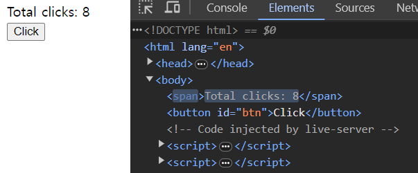 이렇게 작성하면 h3에 있는 count가 잘 변동되고 있는지 확인 할 수 있다. 여기서 왜 React가 효율적인지 확인 할 수 있다. 개발자 창을 열어보고 클릭했을 때 Vanilla Js로 클릭했을 때와 비교해보면 알 수 있다. 아래 더보기로 확인 할 수 있다.