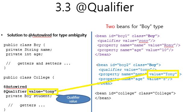 @Qulifier(value="tony") : XML์์ scope์ด ์ค์ ๋์ง ์์ 2๊ฐ์ ๊ฐ์ class๊ฐ ์กด์ฌํ๋ค๋ ๊ฐ์ ์์ value๊ฐ "tony"์ธ ๊ฐ์ฒด๋ฅผ ์ฃผ์ ํ๊ฒ ๋ค๋ ๋ฐฉ์์ผ๋ก ์ฌ์ฉ๋๋ Annotation