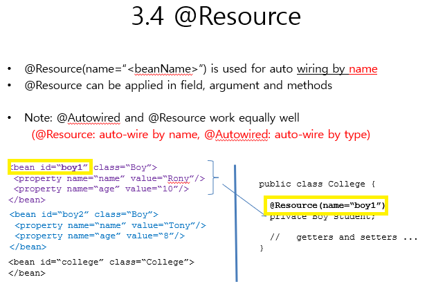 @Resource : Autowired๊ฐ ๋๋ ๋ฐฉ์๊ณผ ๊ฐ์ง๋ง name ์์ฑ์ ํตํด์ bean์ id๋ฅผ ์ฐพ๊ฒ๋๋ค.