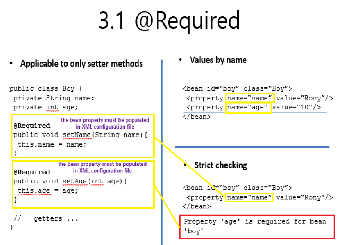 @Required : ํด๋น ํด๋์ค์ ๋ฉํ๋ฐ์ดํฐ์ ์ ๋ณด๋ฅผ ๊ธฐ๋ณธ์ ์ผ๋ก ์ค์ ํด์ฃผ๊ณ ์ ๊ฒํ๋ ์ญํ , Boy๋ผ๋ ํด๋์ค๋ฅผ XML๋ก ๋ถํฐ ๋ฉํ๋ฐ์ดํฐ๋ก name๊ณผ value๊ฐ ์์ผ๋ฉด ํด๋น @Required๊ฐ ์ค์ ๋์ด ์๋ ํด๋์ค์์๋ name๊ณผ value๊ฐ ์กด์ฌํด์ผํ๋ค. ํ์ง๋ง ๋ง์ฝ age์ ๊ฐ์ด @Required์ ์ค์ ๋์ง ์์ ์ ๋ณด๊ฐ ์กด์ฌํ๊ฑฐ๋ @Required๋ก ๋ถํฐ ์ ์๋ ํ ์ดํฐ ํ์ ์ ๋ง์ง ์๋ ๊ฐ์ด ๋ค์ด๊ฐ๋ค๋ฉด ์๋ฌ๋ฅผ ํ์ถํ๋ค.