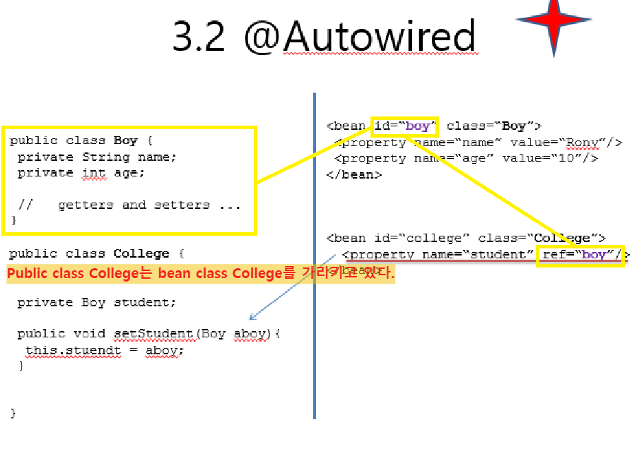 @Autorwired : ์๋์ผ๋ก ๊ฐ์ฒด์ ๊ฐ์ฒด๋ฅผ ์ฐ๊ฒฐํ๋ค. ์ฆ, ์๋์ผ๋ก ์์กด์ฑ์ ์ฃผ์ ํ๋ค.๋ผ๊ณ ์ดํดํ๋ฉด ๋๋ค. scope์ด ์ค์ ๋์ง ์์ singletone์ด default๋ก ์ค์ ๋ ๊ฐ์ฒด๋ฅผ ์๋์ผ๋ก ์ฃผ์ ์ํจ๋ค.