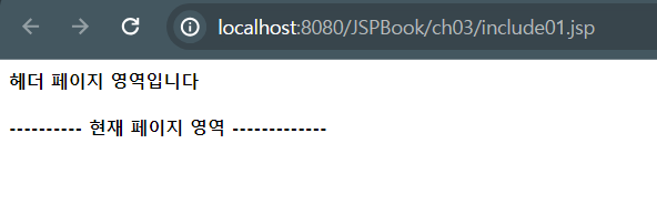 ์์ ์ฝ๋ ์ฒ๋ผ <%@ include file="include01_header.jsp"%>๋ฅผ ์ฝ์ ํด์ include01_ header.jspํ์ผ์ ๊ฐ์ ธ์ฌ ์ ์๋ค. ์ด๋ ๊ฒ ์ฝ๋๋ฅผ ์์ฑํ๊ณ ํฐ์บฃ์ ํตํด์ ํฌ๋กฌ์ผ๋ก ๋ธ๋ผ์ฐ์ ์ ๋์ฐ๋ฉด ์๋์ ๊ฐ์ ๊ฒฐ๊ณผ๊ฐ ๋์จ๋ค.