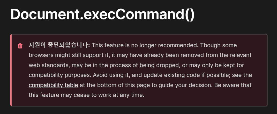 execCommand() : ์ง์์ด ์ค๋จ๋์์ต๋๋ค: This feature is no longer recommended. Though some browsers might still support..