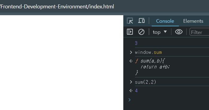 ๊ธฐ๋ณธ sum ํจ์๋ฅผ ์์ ๊ฐ์ด ํ์ด ํ๊ธฐ๋ฒ์ผ๋ก ๋ณ๊ฒฝ ํ๋ค. ๊ทธ๋ฆฌ๊ณ ์ด๋ฅผ ๋ธ๋ผ์ฐ์ ์์ window.sum์ผ๋ก ์ ๊ทผํ๋ ค๊ณ ํ๋ฉด undfiend๊ฐ ๋์จ๋ค. ์ผ๋ฐ์ ์ผ๋ก sum ํจ์๋ฅผ ์ฌ์ฉ ํ ์ ์์ง๋ง ์์ ๊ฐ์ด sum์ ์ ์ธํ๋ ค๊ณ ํ๋ฉด type error๊ฐ ๋ฐ์๋๋ฉด์ ์ ์ด์ sum์ ์๋ก์ด ๋ณ์๋ก ์ ์ธ์ด ๋ถ๊ฐ๋ฅ ํ๊ฒ ๋๋ค.