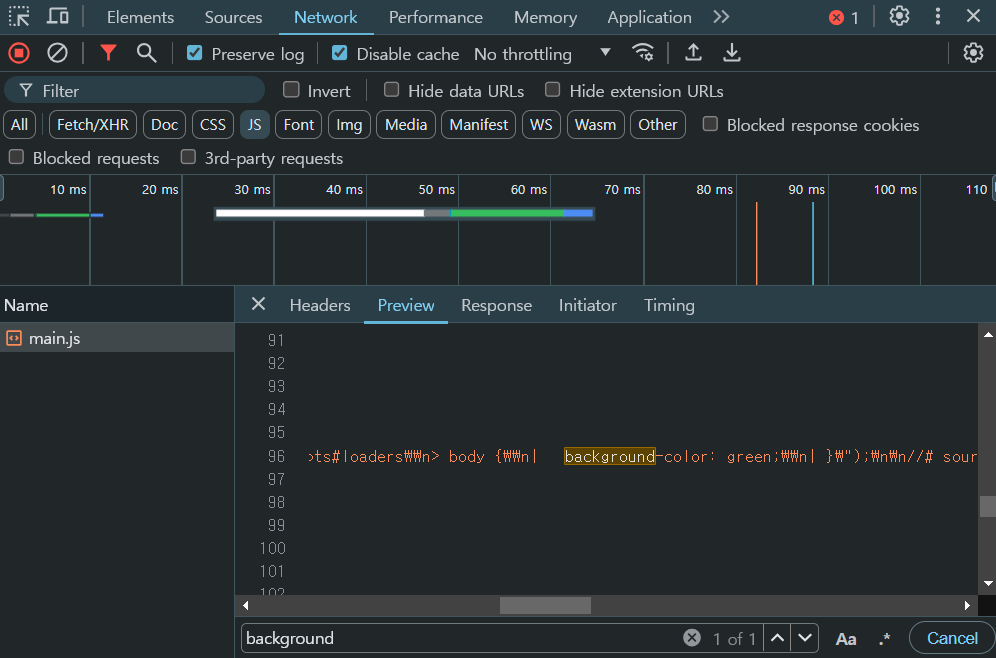 ์์ ๊ฐ์ด ์ค์ ์ ํ๋ฉด Entry ํฌ์ธํฐ ๋ถํฐ ๋ชจ๋ ํ์ผ๋ค์ ํ์ธํ๋ฉด์ ์ฐ๋ฆฌ๊ฐ ์ค์ ํ css ํ์ผ์ ํ์ธํ๊ณ ์ด๋ฅผ css-loader๊ฐ css ํ์ผ์ ์ฒ๋ฆฌํ๊ฒ ๋ ๊ฒ์ด๋ค. ๋ค์ yarn run build๋ฅผ ํ๊ฒ๋๋ฉด ์ฑ๊ณต์ ์ผ๋ก ๋น๋๊ฐ ๋๊ณ dist ํด๋ ์๋๋ฅผ ํ์ธํ๋ฉด main.jsํด๋ ๋ด๋ถ์ ์๋์ ๊ฐ์ด css์ฝ๋๋ฅผ ํ์ธ ํ ์ ์๋ค.