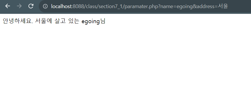 http://localhost:8088/class/section7_1/paramater.php?name=egoing&address=%EC%84%9C%EC%9A%B8