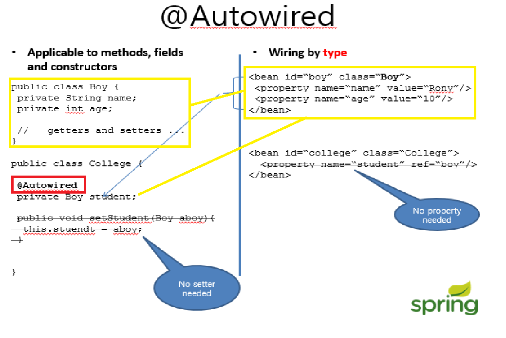 @Autorwired : ์๋์ผ๋ก ๊ฐ์ฒด์ ๊ฐ์ฒด๋ฅผ ์ฐ๊ฒฐํ๋ค. ์ฆ, ์๋์ผ๋ก ์์กด์ฑ์ ์ฃผ์ ํ๋ค.๋ผ๊ณ ์ดํดํ๋ฉด ๋๋ค. scope์ด ์ค์ ๋์ง ์์ singletone์ด default๋ก ์ค์ ๋ ๊ฐ์ฒด๋ฅผ ์๋์ผ๋ก ์ฃผ์ ์ํจ๋ค.